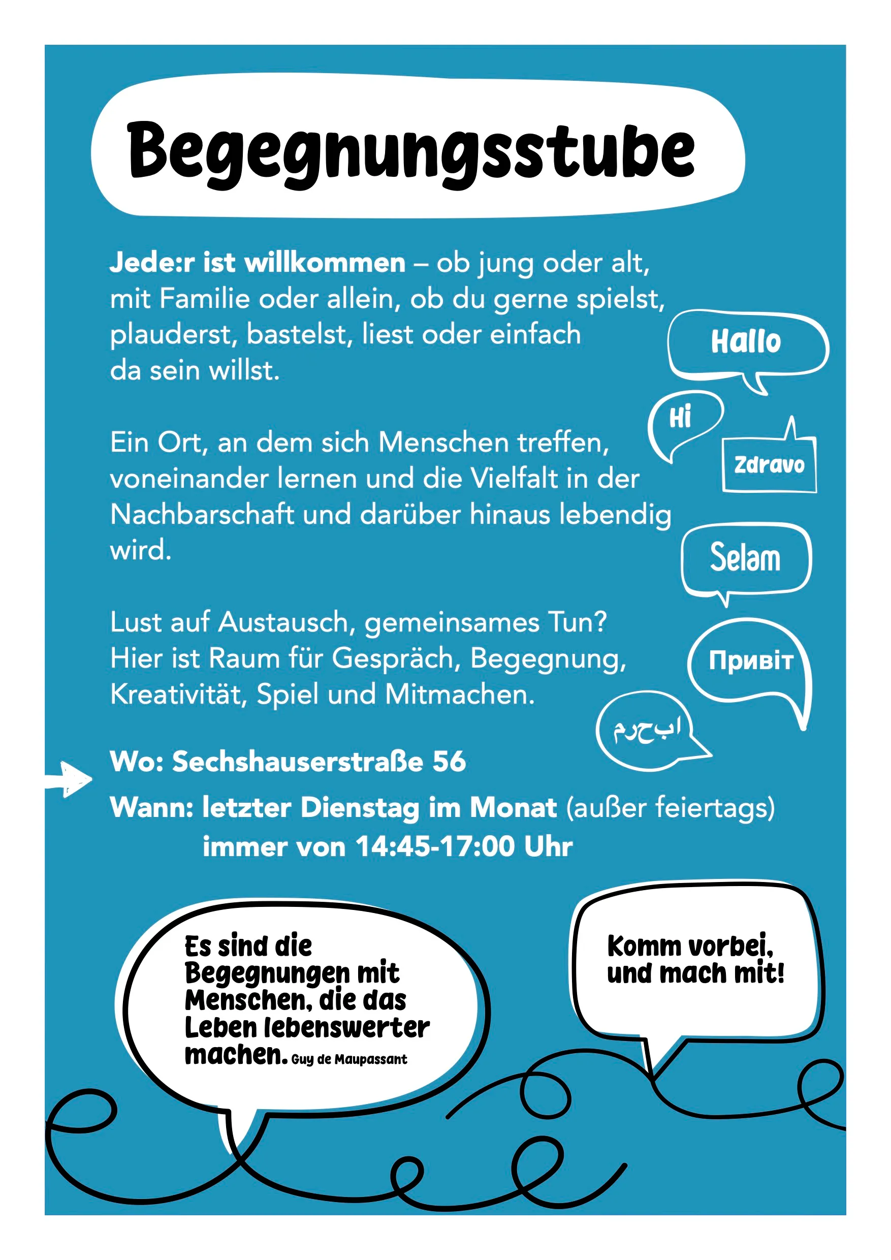 Herzlich Willkommen in unserer Begegnungsstube – immer am letzten Dienstag im Monat von 14:45-17:00 Uhr! Sei dabei, sei willkommen!