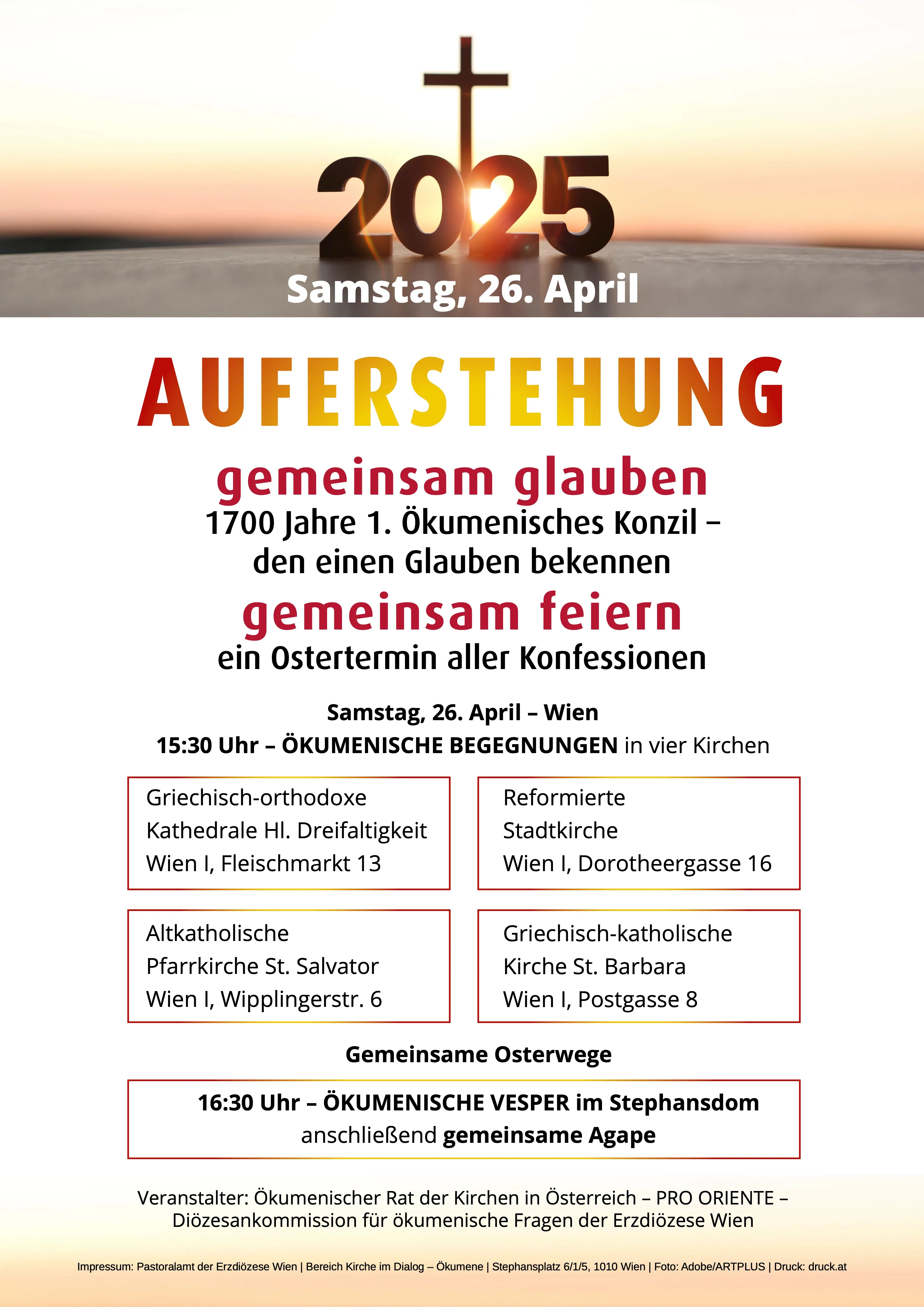Anlässlich des 1700-Jahr-Jubiläum des 1. Ökumenischen Konzils in Nizäa und des in diesem Jahr gemeinsamen Ostertermins aller Konfessionen findet eine ökumenische Begegnung in verschiedenen Kirchen statt. Mehr Infos
