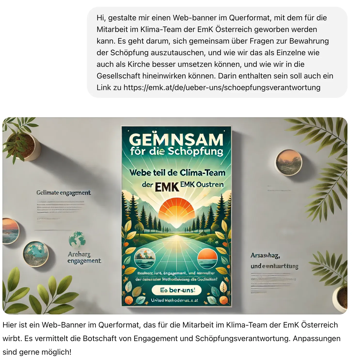 Zumindest der Versuch, mittels KI ein Werbebanner für die Mitarbeit im EmK-Klimateam zu gestalten, war nicht gerade vielversprechend: