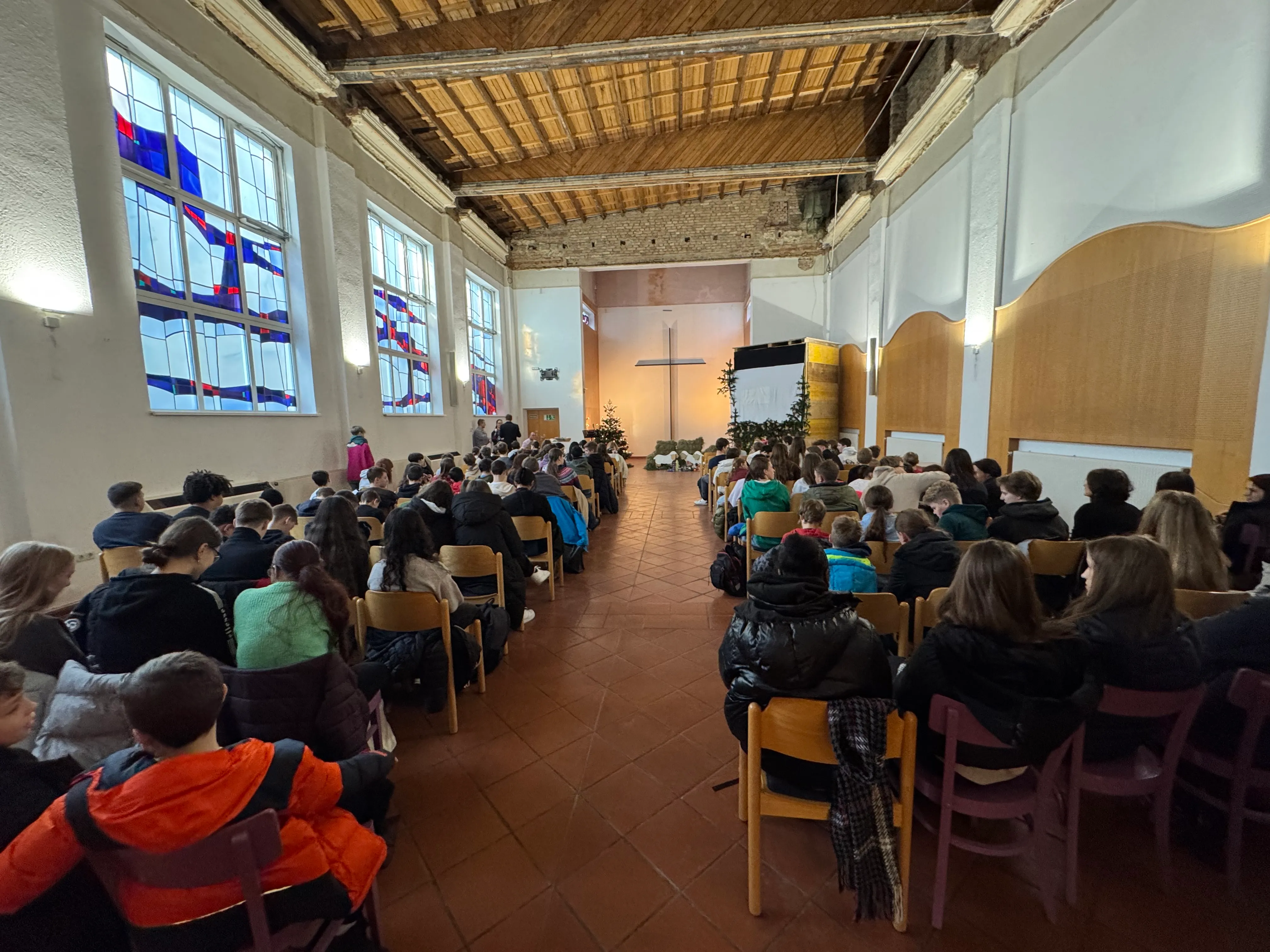 Ca. 120 Schüler*innen, die den römisch-katholischen, orthodoxen oder evangelischen Religionsunterricht im benachbarten Diefenbachgymnasium besuchen, haben ihren ökumenischen Schulgottesdienst in der Sechshauserstraße gefeiert. Mittlerweile ist dieser Gottesdienst eine Woche vor Weihnachten bereits zur Tradition geworden.