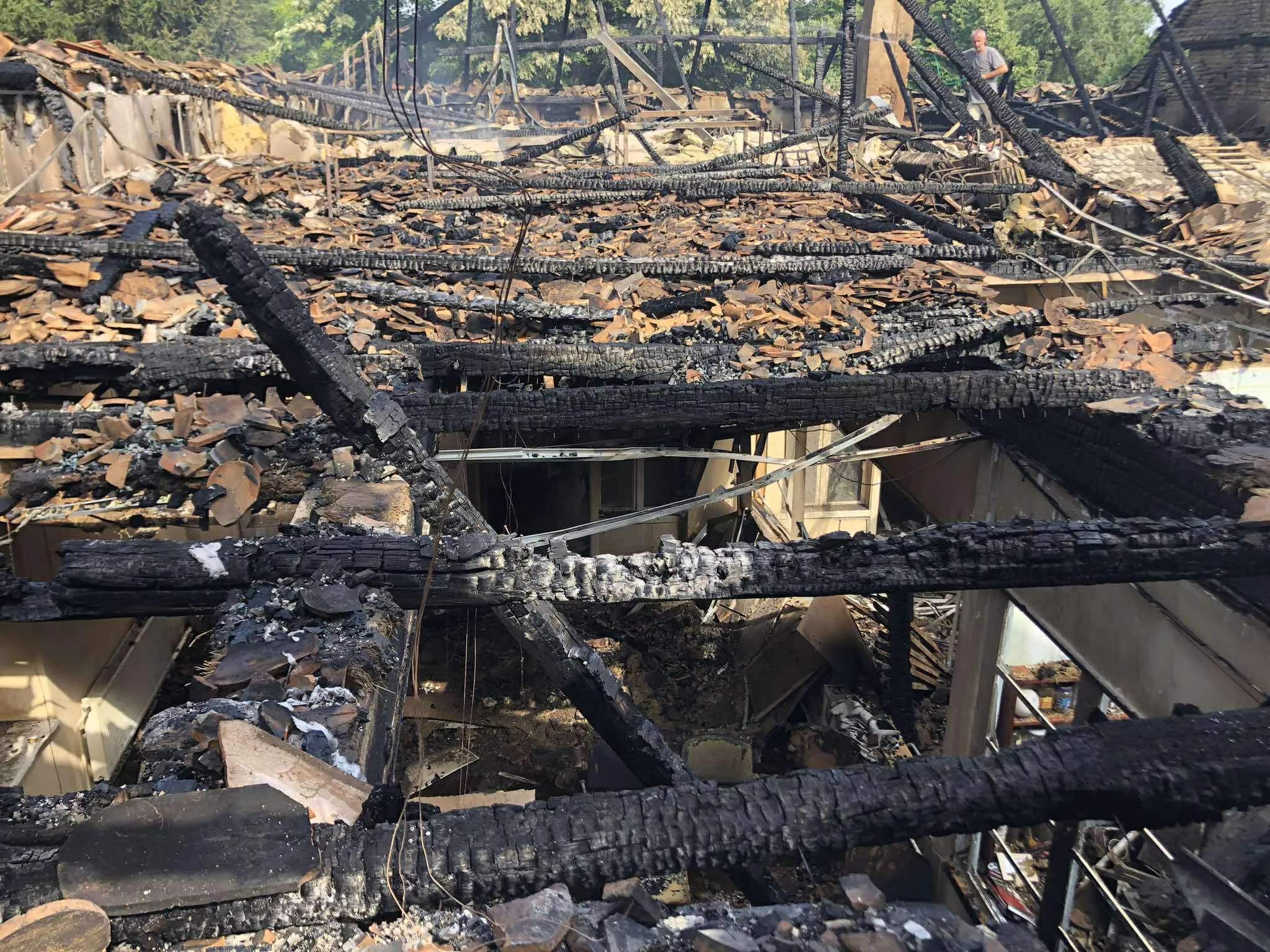 Das ganze Dach brannte nieder, und im mittleren Teil des Gebäudes – wo sich der Gottesdienstsaal befindet – stürzte es in sich zusammen. Dass die Decke nicht aus Zement bestand, sondern aus Holz, Heu und Lehm, trug ebenfalls seinen Teil zum Einsturz des Daches bei. Oberhalb der Wohnung blieb die Decke zwar intakt, aufgrund des durch die Löscharbeiten verursachten Wasserschadens begann sie aber schließlich auch dort einzustürzen und musste aus Sicherheitsgründen ebenfalls heruntergerissen werden.