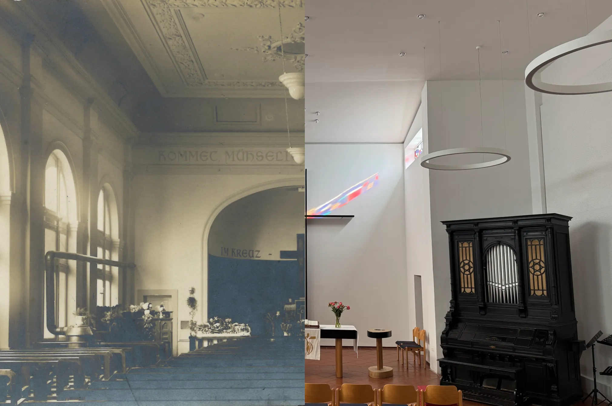 "Am 21. September feierte die alpine Gesellschaft 'd Iustigen Kraxler" ihr achtes Gründungsfest verbunden mit einer Kaieserhuldigung in dem vom Klubrestaurateur Josef Straßer in der Reindorfgasse neuerbauten Jubiläumssaal. Dieser wurde nach den Plänen und unter Leitung des Architekten A. Korneisl und des Baumeisters J. Bublick gebaut." So berichtet die Wiener Zeitung "Die Zeit" in der Ausgabe vom 2. Oktober 1908 erstmals über den Kirchensaal, der heute unter der Adresse Sechshauser Straße 56 bekannt ist. Wenige Jahre wurde er für Feste, Chorgesang, Vereine und politische Versammlungen genutzt. Zu den Rednern im Jubiläumssaal zählen auch der spätere Bundespräsident Karl Renner und der spätere Wiener Bürgermeister Karl Seitz.