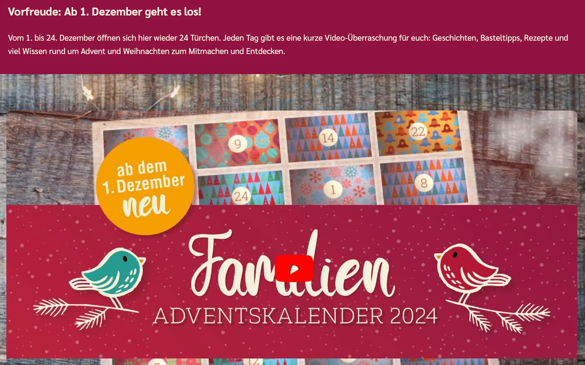 Der Familien-Adventskalender ist ein Angebot der Evangelisches Medienhaus GmbH in Stuttgart. 24 tägliche Video-Überraschungen laden die gesamte Familie zum weihnachtlichen Basteln, Singen, Backen und Miträtseln rund um den Advent und Weihnachten ein.