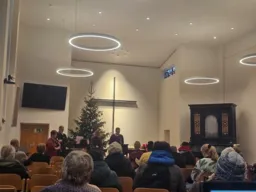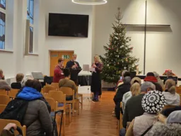 Viele Gäste ließen sich auch zu unserer liturgisch gestalteten Weihnachtsfeier einladen, die in diesem Jahr zum ersten Mal im Kirchensaal stattfand. Durch den geschmückten Christbaum und die Kerzen am Adventkranz wurde die weihnachtliche Atmosphäre gleich für alle spürbar. Bekannte Weihnachtslieder wurden durch Blockflöten zu Gehör gebracht, die Weihnachtsgeschichte aus dem Lukasevangelium wurde auf Deutsch und auf Englisch vorgelesen, und Pastorin Antje und Pastor John sprachen in beiden Sprachen Gebete. Mama Muh nahm uns mit hinein in das Wunder, das da im Stall von Bethlehem geschehen ist, und ließ uns für einen Moment alles andere vergessen.