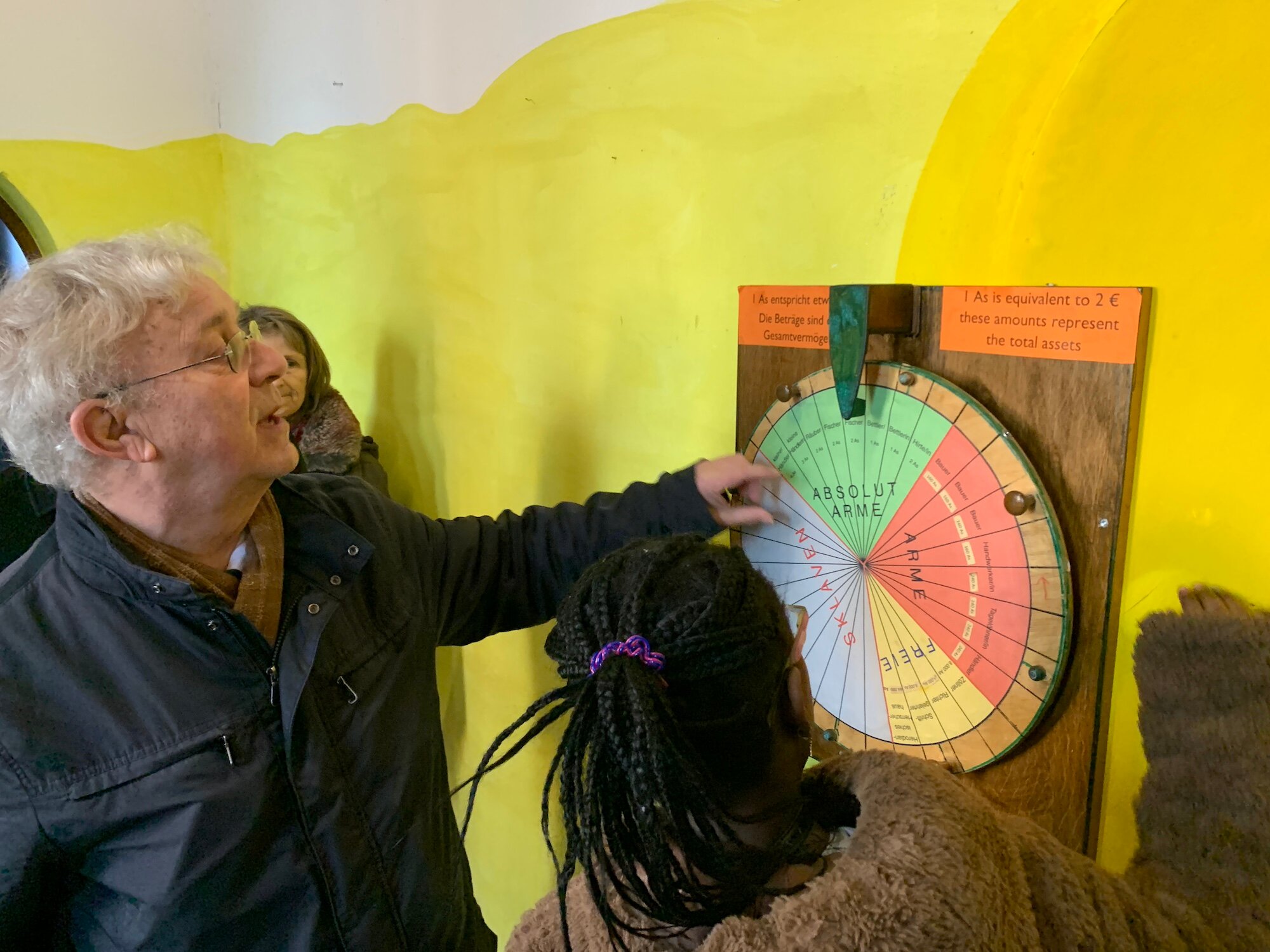 Wir drehen am Glücksrad und finden heraus, ob wir zu den Sklav*innen (der Großteil der Bevölkerung zur Zeit Jesu), den Armen, den absolut Armen oder zu den Freien gehören.