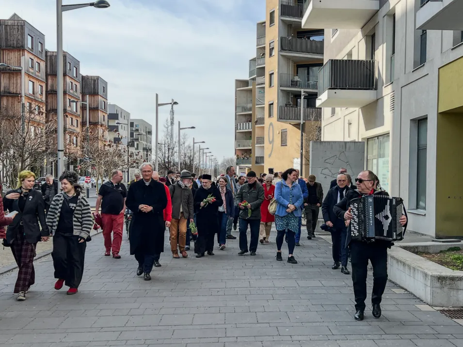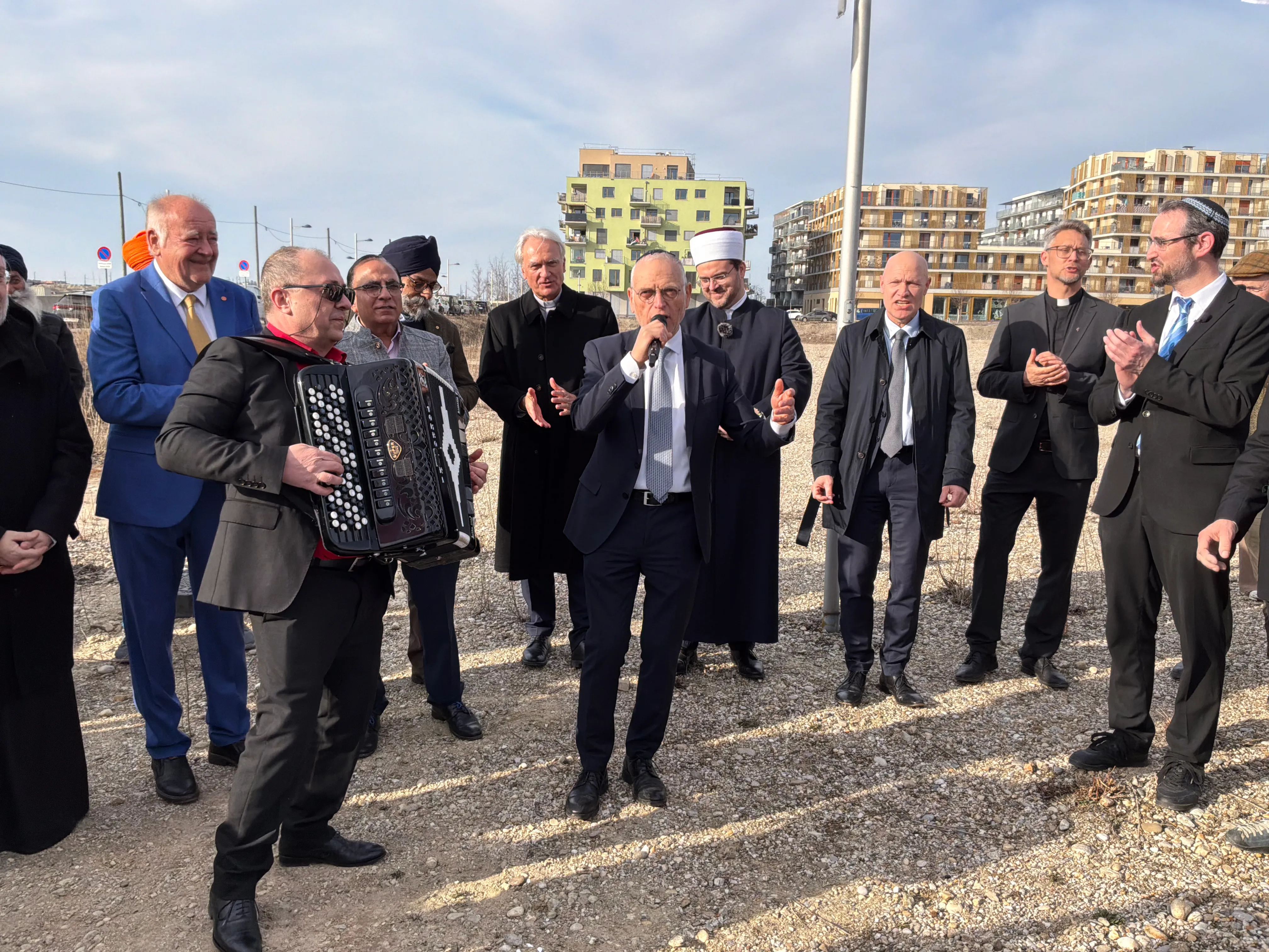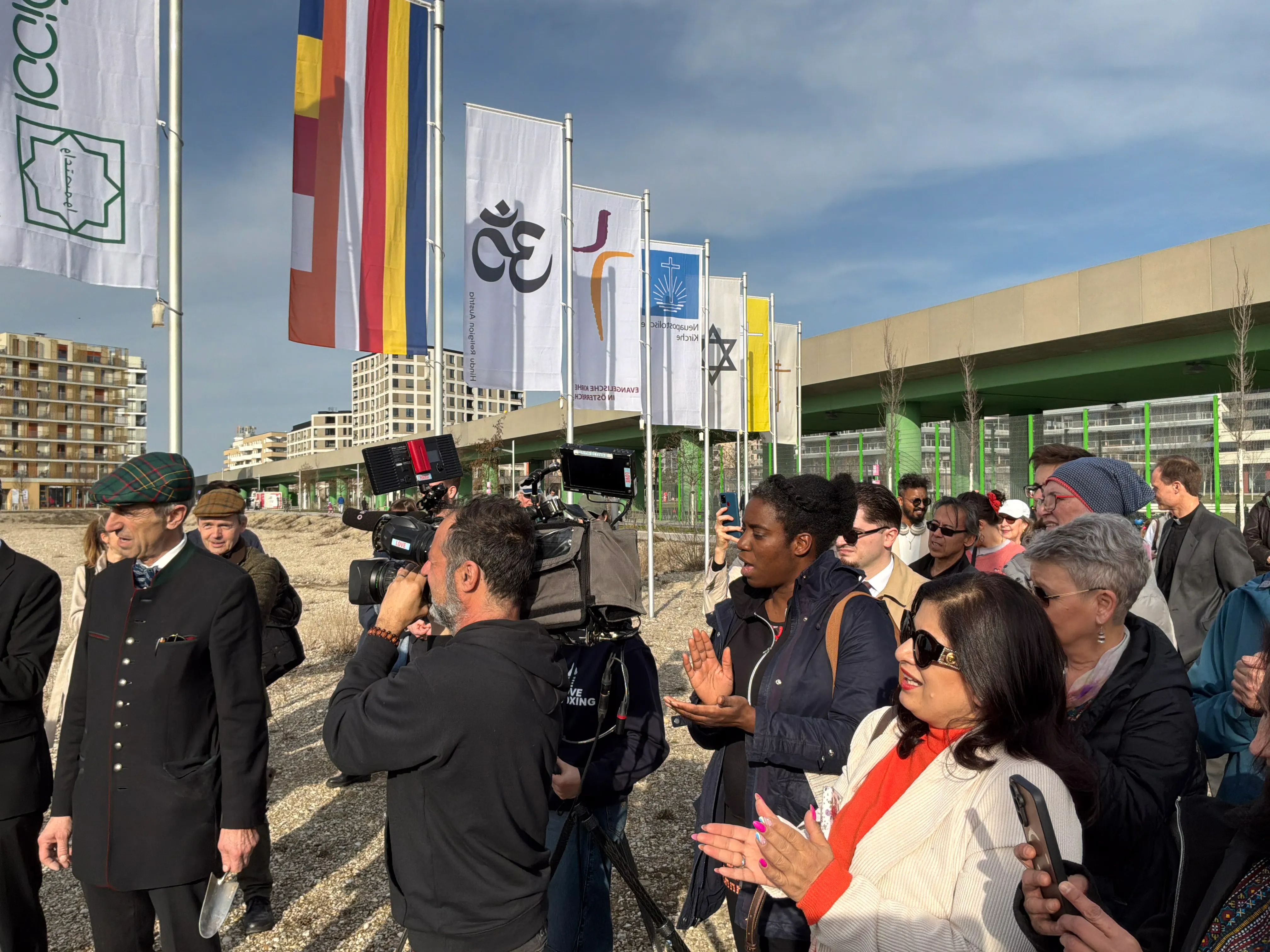 Mehr als 150 Personen aus den verschiedenen Religionsgemeinschaften haben sich dem gemeinsam Weg vom römisch-katholischen Edith-Stein-Zentrum in der Seestadt Aspern zum Gelände des Campus der Religionen angeschlossen, wo die Wiener Erklärung – Religionen für den Frieden – feierlich unterzeichnet wurde.