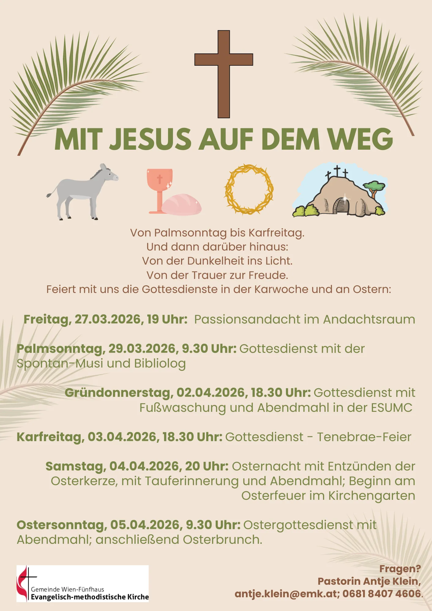Vom Jubel zur Einsamkeit. Von absoluter Dunkelheit ins Licht. Von Trauer zur Freude. Vom Tod ins neue Leben. Diesen Weg gehen wir mit Jesus in der Woche vor Ostern (und auch schon am Freitag vor Palmsonntag) bis zum Ostersonntag. Herzliche Einladung, in der EmK Wien-Fünfhaus (Sechshauser Str. 56, 1150 Wien) mitzufeiern!