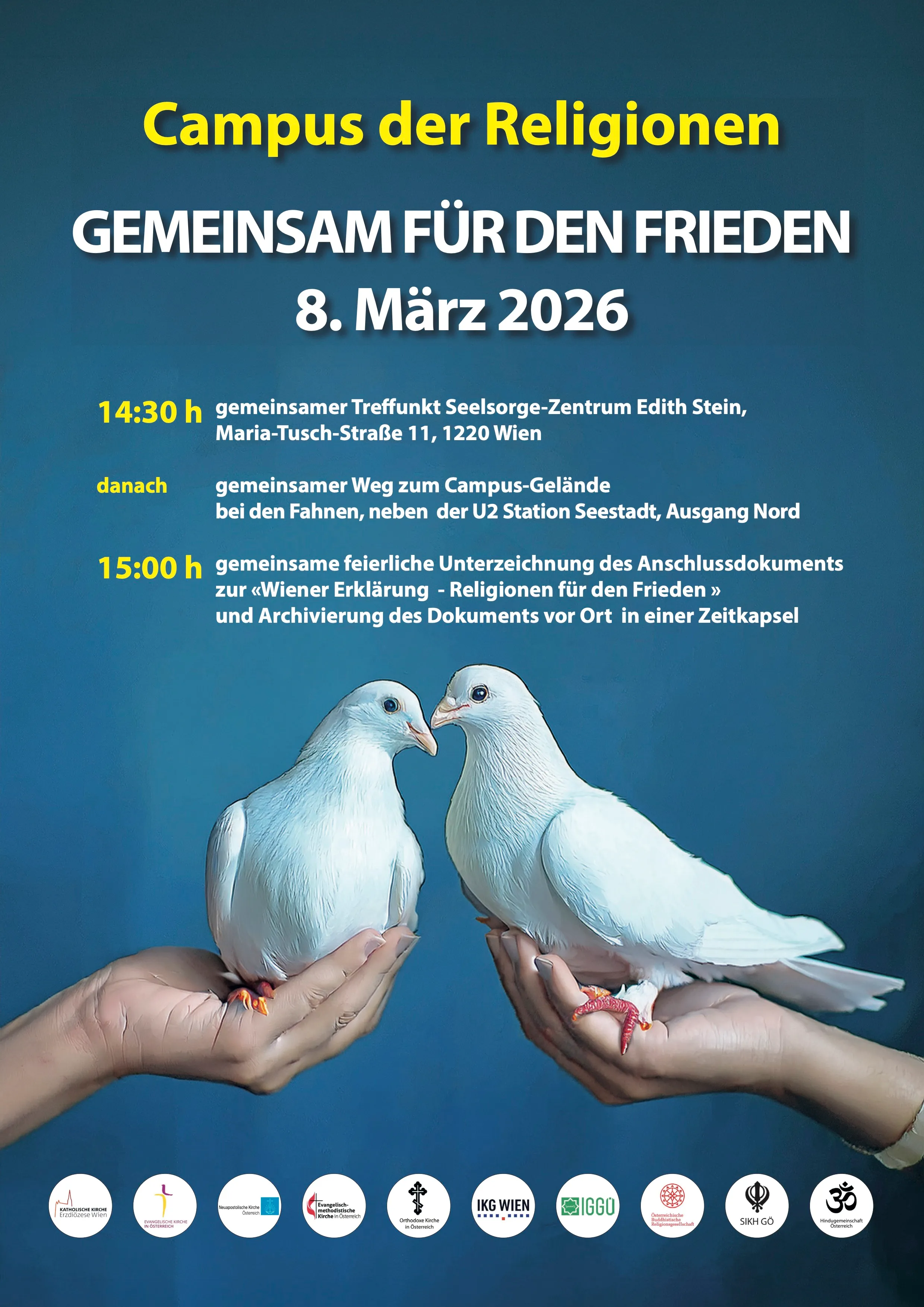 Sie laden ein zu einem gemeinsamen Weg durch die Seestadt, um schließlich an jenem Platz, der im Stadtentwicklungsgebiet Seestadt derzeit für den Campus der Religionen reserviert ist, sich der »Wiener Erklärung – Religionen für den Frieden« anzuschließen. Das Dokument wird – musikalisch umrahmt – feierlich unterzeichnet und vor Ort in einer Zeitkapsel archiviert.