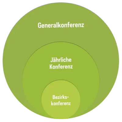 Von der lokalen Gemeinde bis zur weltweit höchsten Ebene, der Generalkonferenz, sind alle Gremien und Konferenzen unserer Kirche demokratisch gewählt. Alle Ämter stehen Frauen und Männern offen. Alle Entscheidungen werden gemeinsam von Laien und Pastorinnen und Pastoren getroffen. Es gibt gewählte Bischöfinnen und Bischöfe, die die Aufsicht über geographische Regionen haben und die Jährlichen Konferenzen leiten, ohne dabei selbst Stimmrecht zu haben.