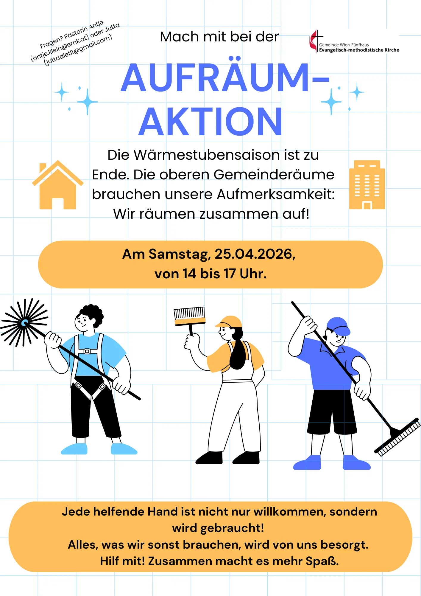 Die Wärmestubensaison ist bald zu Ende. Der Frühling ist da. Mit ihm die Zeit für eine Aufräum-Aktion, fürs Ausmisten und Wieder-in-Ordnung bringen für die kommenden Monate! Helft uns beim Aufräumen in unseren Gemeinderäumen am 25.04.2026, von 14 bis 17 Uhr. Gemeinsam sind wir schneller und schaffen mehr! Alle wichtigen Infos findet ihr unten auf dem Flyer.