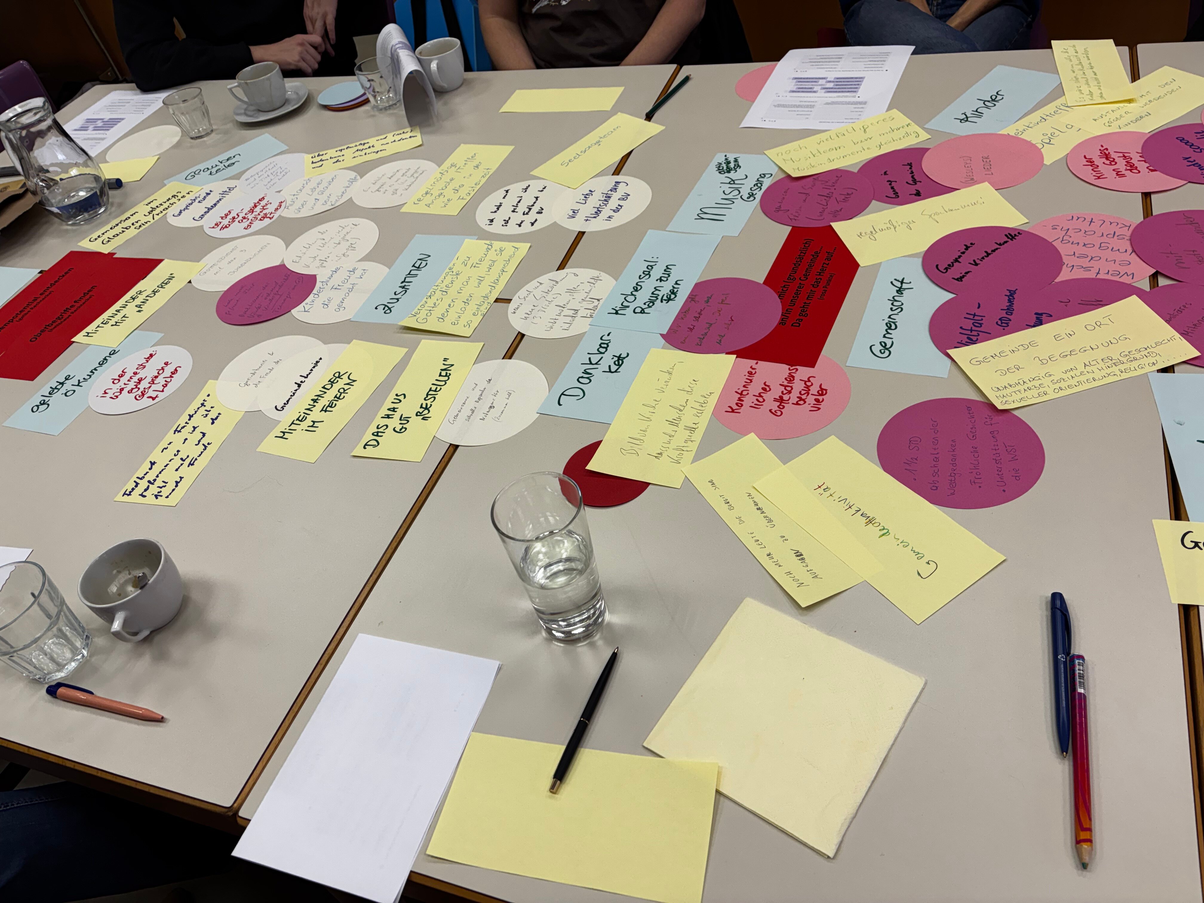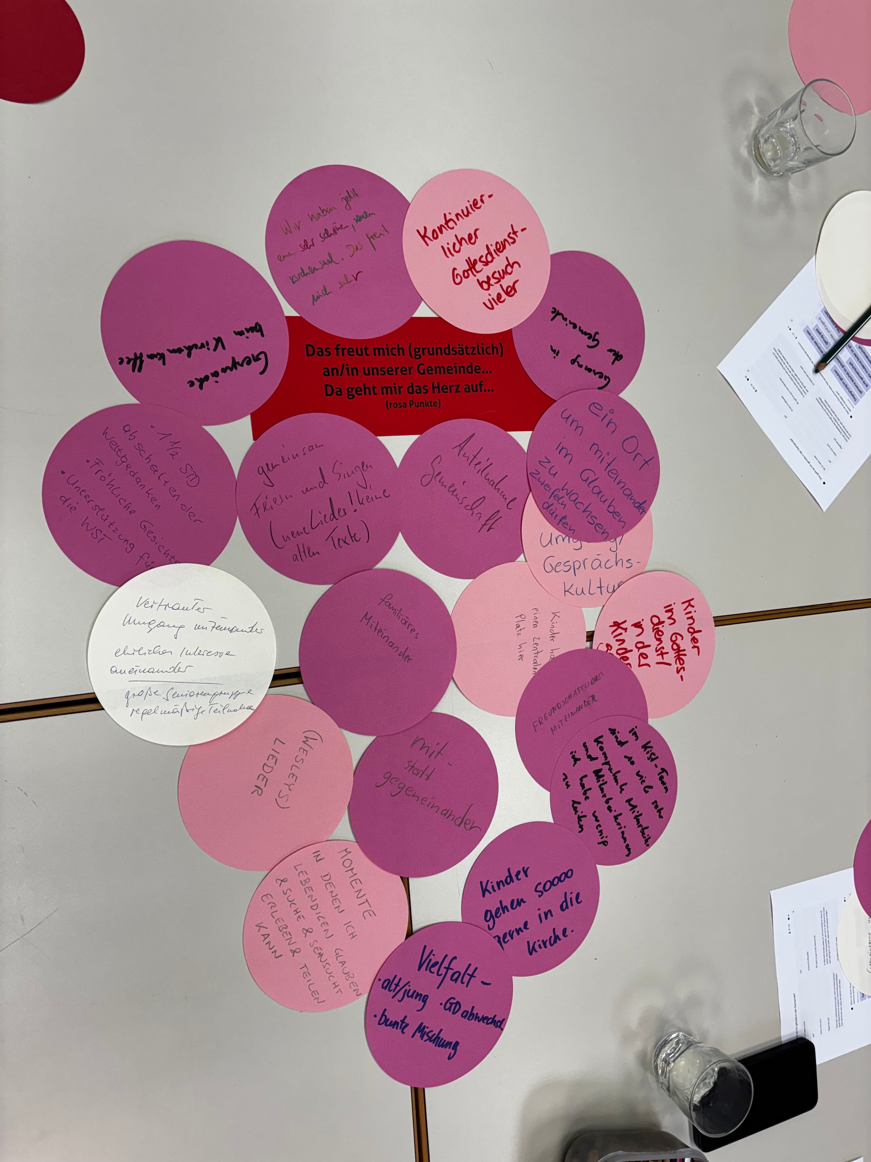 Diese Freude zu entdecken, zu erkunden und miteinander zu teilen, das war das Ziel des größten Blocks des Vormittags. An dessen Ende lag eine ganze Fülle vor uns, die es ohne das Teilen nicht gegeben hätte: Freude über Vielfalt und Miteinander, über Musik und das Teilen von Glauben (um nur ein paar Beispiele zu nennen). Potential für noch mehr Freude im Feiern und in Begegnungen mit Menschen, die wir jetzt noch nicht kennen. "Freudenpotential" haben wir das genannt, und darüber nachzudenken und uns davon zu erzählen, wo wir diese Möglichkeiten wahrnehmen, hat Lust gemacht, diese weiter auszuloten. Wir glauben, dass Gott uns in diesem Prozess auch in Zukunft begleitet. Und wir bitten Gott darum - damit wir noch besser erkennen, wohin Gott uns leiten will. Betet doch mit!