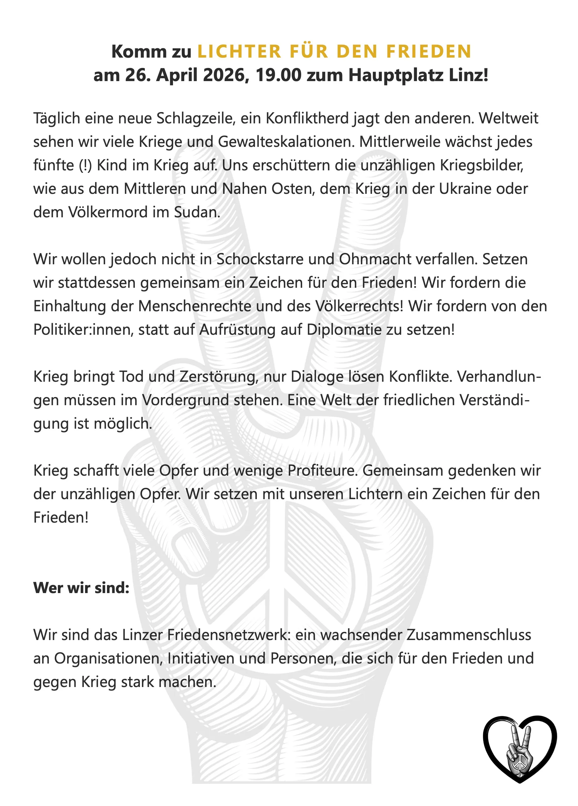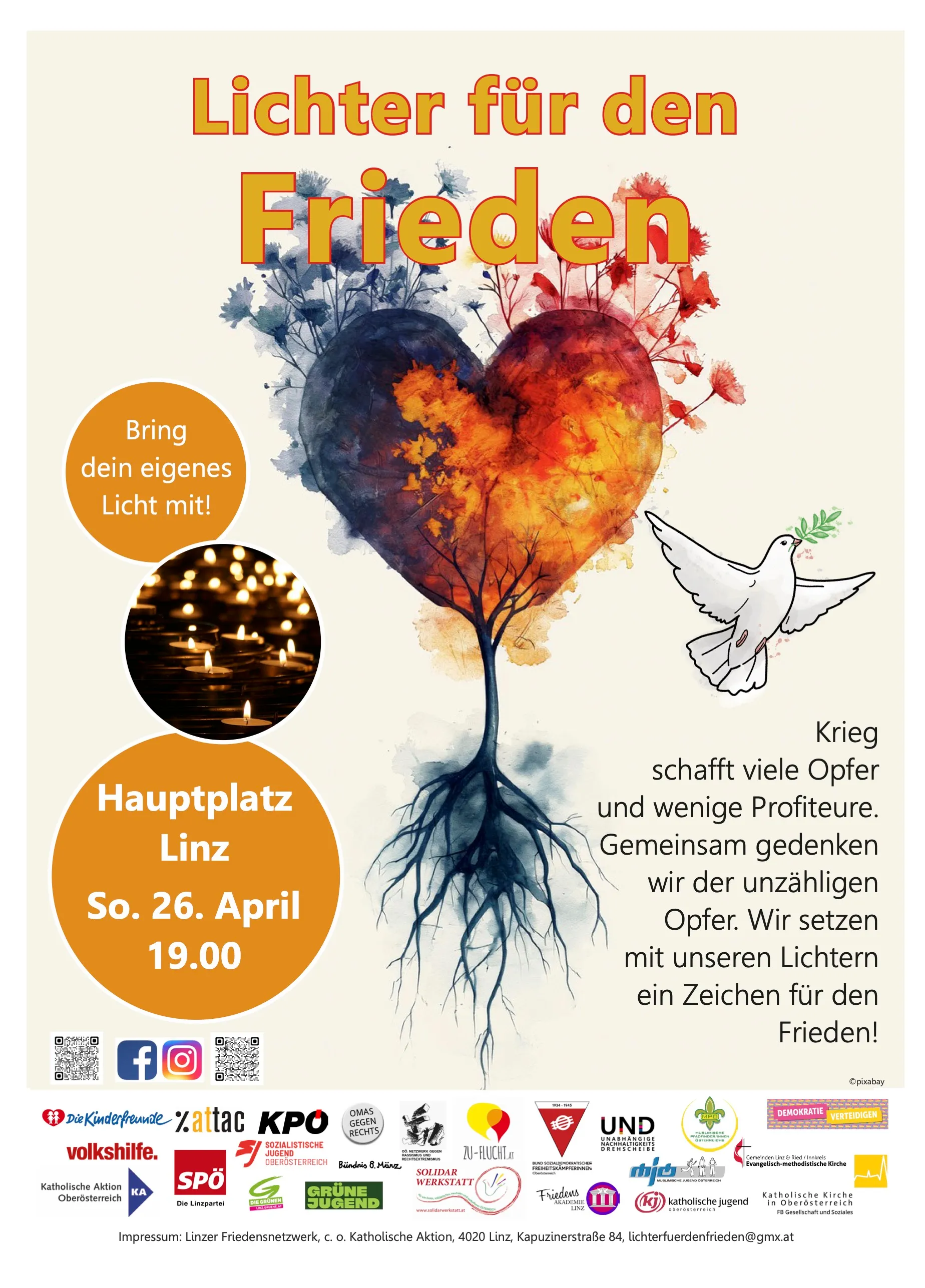 Komm zu LICHTER FÜR DEN FRIEDEN am 26. April 2026, 19.00 zum Hauptplatz Linz!