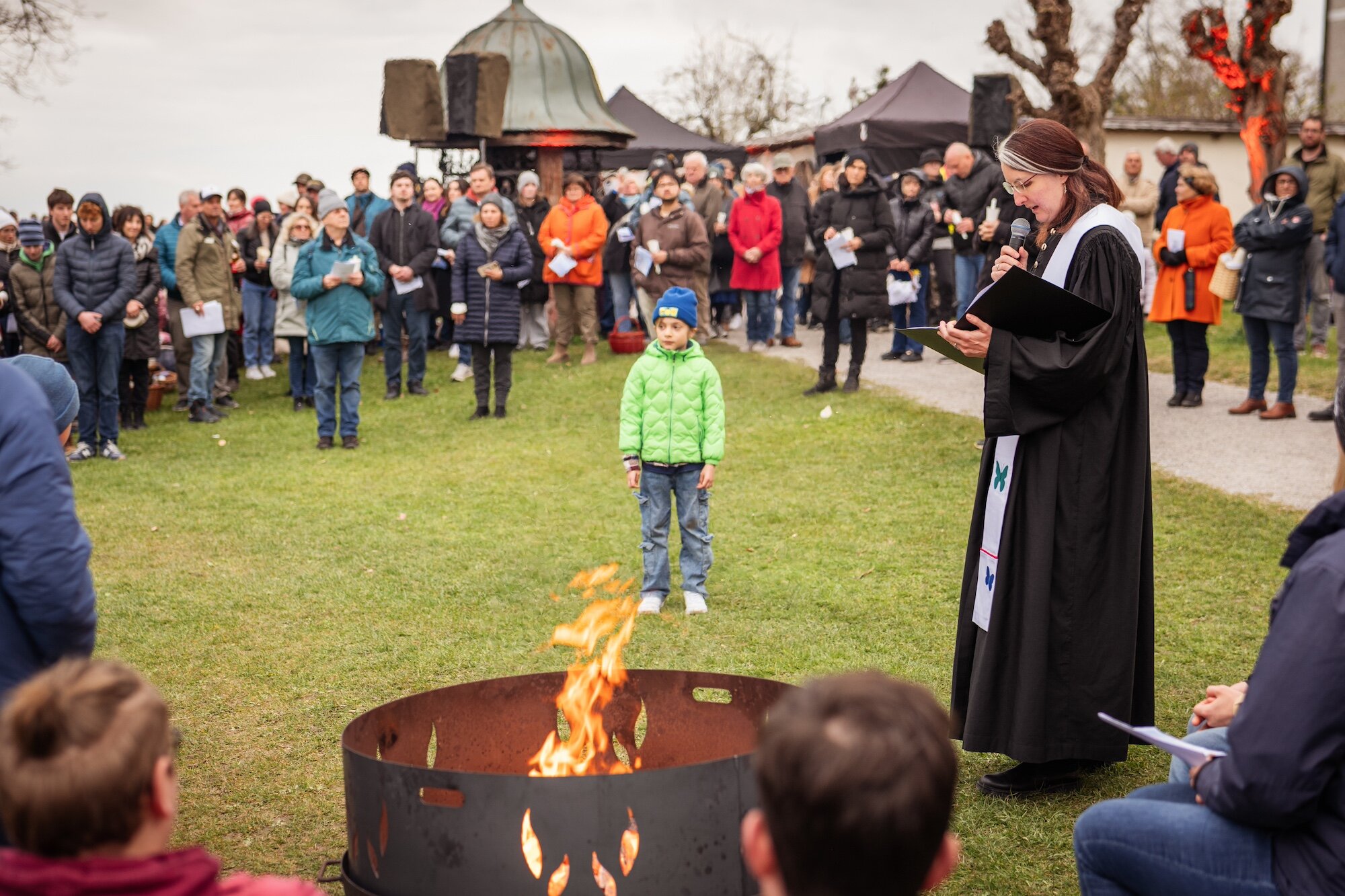 Gebet am Osterfeuer, das von den Pfadfinder*innen aufgebaut und betreut wurde.